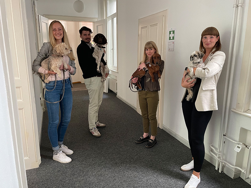 Im Landvolkhaus, mitten in Hannover, begleiten derzeit vier Hündinnen Kolleginnen und Kollegen ins Büro, bestehend aus einem bunten Mix: Ein Shi-Tzu, ein Dackel, ein Havaneser und ein Münsterländer – verteilt auf drei Stockwerke. Aber warum bieten die Hunde eigentlich Vorteile? Dafür gibt es mehrere Gründe: Ein Hund im Büro kann erheblich zur Stressreduzierung beitragen. Durch das Streicheln des flauschigen Hundefells wird die Freisetzung von Wohlfühlhormonen wie Oxytocin gefördert und sogar der Blutdruck gesenkt. Vor allem aber in stressigen und herausfordernden Zeiten kann ein Hund helfen, den Stresspegel der Mitarbeiter abfallen zu lassen. Es ist sogar schon üblich, dass Kollegen einen kurzen Zwischenstopp einlegen und einen der Hunde streicheln. Ein Stopp in der ersten Etage scheint für Einige zur Morgen-Routine geworden zu sein. Davon profitieren Mensch und Tier.
